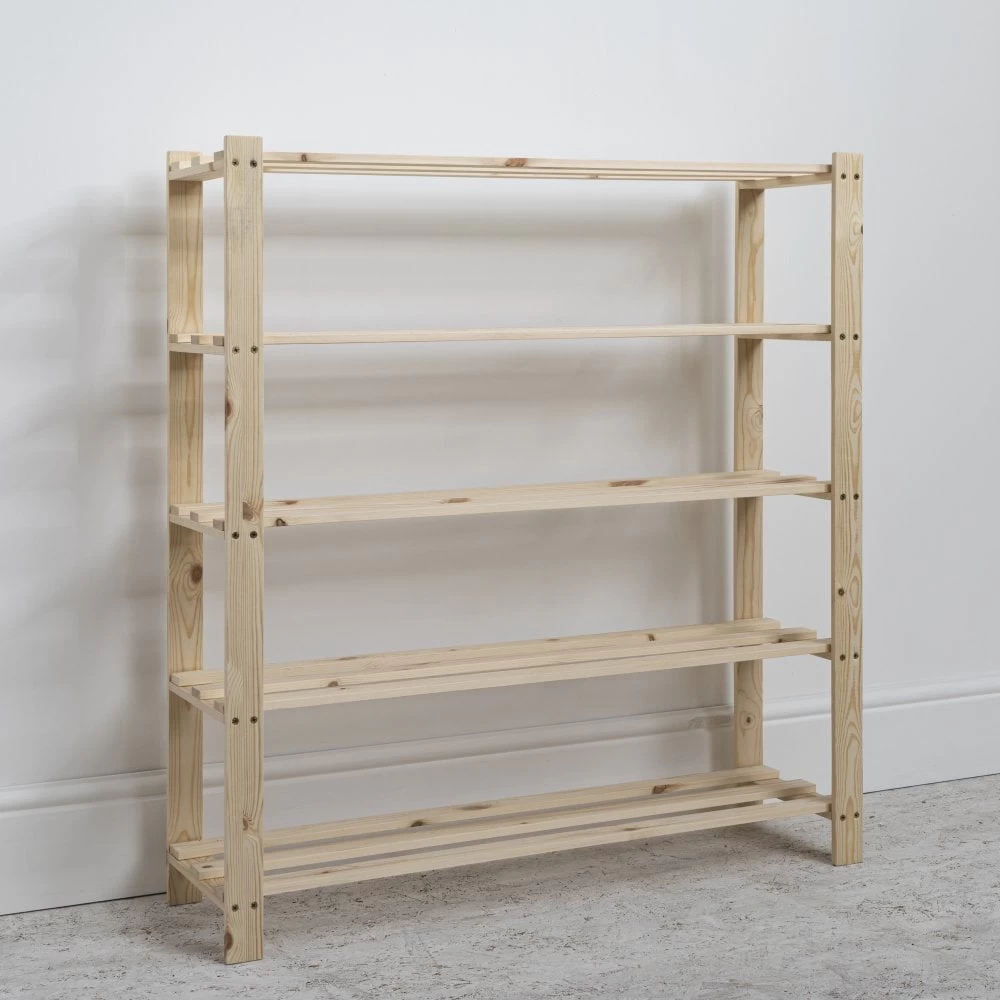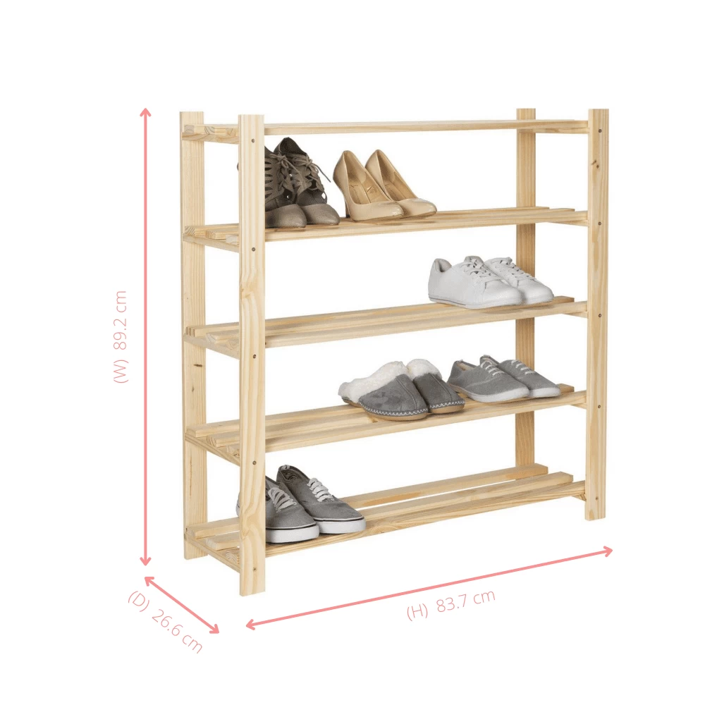 Streamline your entranceway with our spacious 5-Tier Shoe Rack. Offering generous space to accommodate your family’s footwear, this large shoe rack is a lifesaver for busy households. Essential for transforming your hallway from chaotic to calm in no time, the rustic shoe rack optimises your space with a dab of style. Crafted from a lovely natural pine, the authentic wood texture is inviting and homely. Accessorise with wicker baskets and luscious plants to create a warm and welcoming vibe as soon as you step through the door. Bliss.