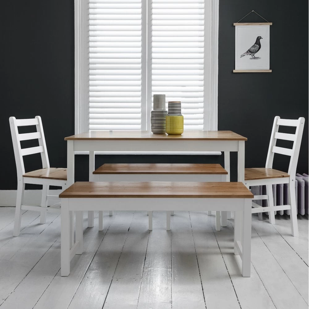 Annika Dining Table With 2 Chairs & 2 Benches In White & Natural Pine