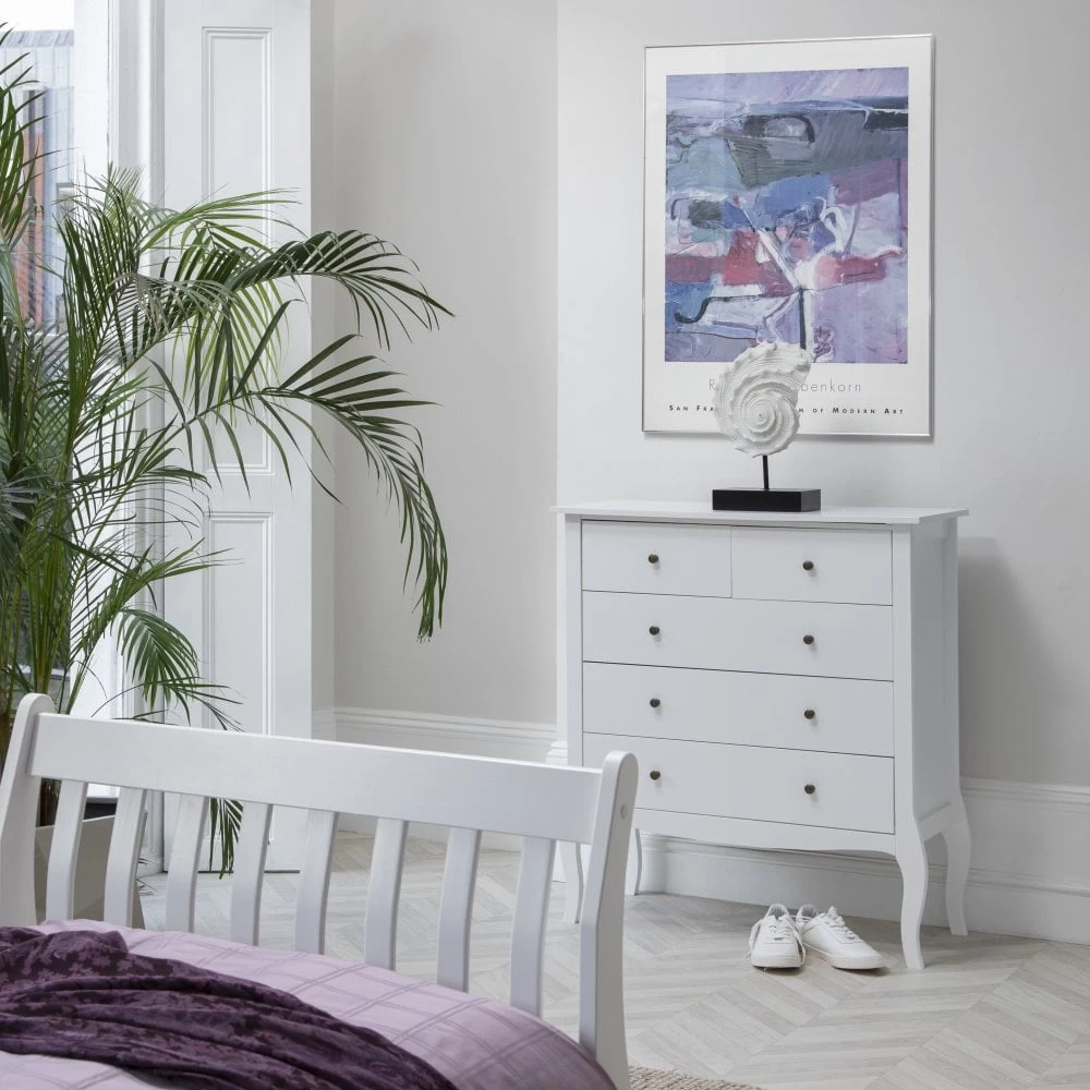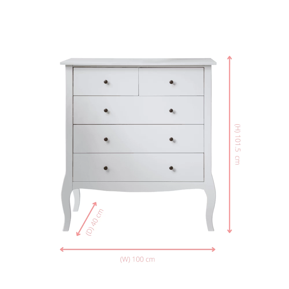 Add style and elegance to your bedroom with the Camille chest of drawers. Simple, chic design combines with beautiful soft white and curvaceous legs for a classic finish that will sit perfectly in a bedroom, living room or hallway. The three plus two drawer formation provides ample storage for clothes, essentials or knick-knacks to be neatly hidden away, out of sight in one elegant solution. French-inspired design is given a fresh, modern edge with the Camille chest of drawers – sleek, minimal lines, create a clean and simple silhouette that oozes charm for your room revamp. Its solid and sturdy structure makes this piece a worthy investment to provide you with the storage solution you need to help keep your home pristine and clutter free. Complete your room makeover with the rest of the Camille range – choose from a shoe storage unit, bedside table, wardrobe, dressing table and hallway table – you really can transform your home with this charming collection.