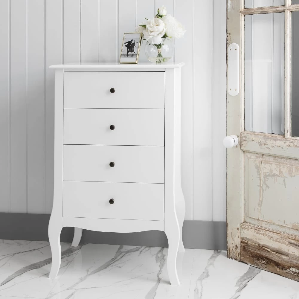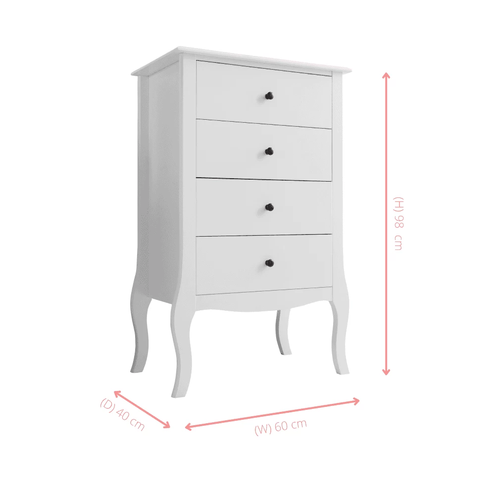 The gorgeous Camille is perfect for channelling an understated luxury. Introducing this pretty chest of drawers into your bedroom is sure to create character and sophistication wherever it is placed. Simple, yet elegant, the solid pine chest is serene and stylish thanks to its chic white hue, whilst French-style legs add a decorative flair to the minimal piece. Four drawers offer a graceful home for lingerie, t-shirts, accessories and other bedtime essentials. To ensure a harmonious bedroom style, team the chest with our matching Camille furniture. Choose from charming bedside tables to pretty desks and mirrors.