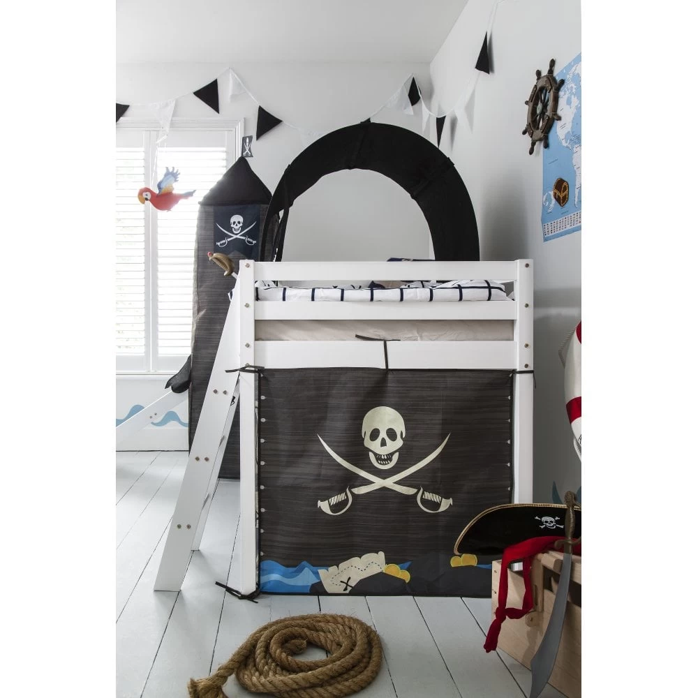 Ahoy there & welcome to the Pirate Hideaway! This exciting cabin bed is a paradise for mini pirates on the run! There’s a watchtower where you can keep an eye out for enemy ships, a tunnel & den perfect for lying low when sailors come looking for you & even a sleeping spot to get some much-needed shuteye. Ay, the pirate life can be exhausting! If all else fails & you need to abandon ship, simply make a quick getaway down the handy slide! Crafted from solid pine, the cabin bed is safe & sturdy, making it the ultimate pirate hideaway!