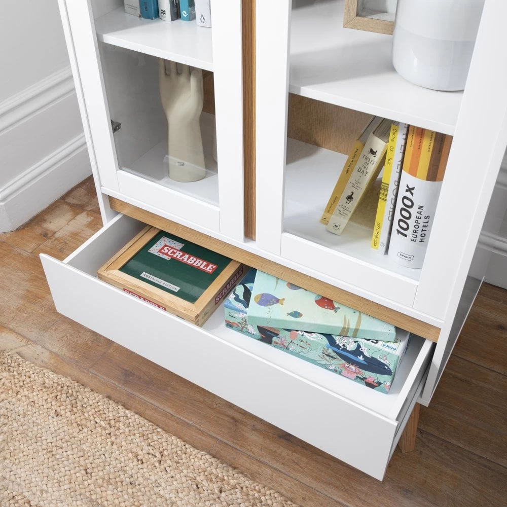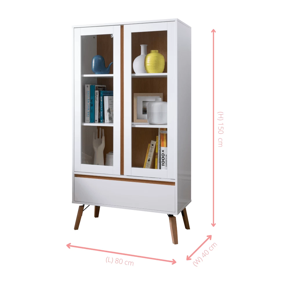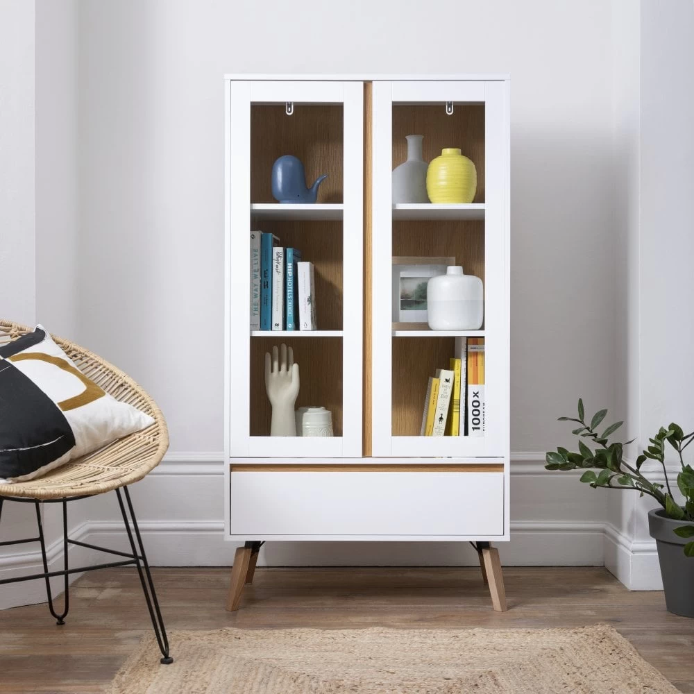 Simplify your living room with our contemporary Otto Display Cabinet. Beautifully minimal and oh-so-chic, the cabinet offers a modern space to display your treasured pieces. Pretty plants, stylish photography books and ornate photo frames are visual behind the glass doors, whilst a handy drawer to the bottom of the cabinet is perfect for concealing kid’s toys and general clutter. Sporting a fresh white shade and natural pine accents, Otto elevates modern living rooms and brings an effortless style thanks to its clean, neat and unfussy aesthetic. Also available in grey.Â