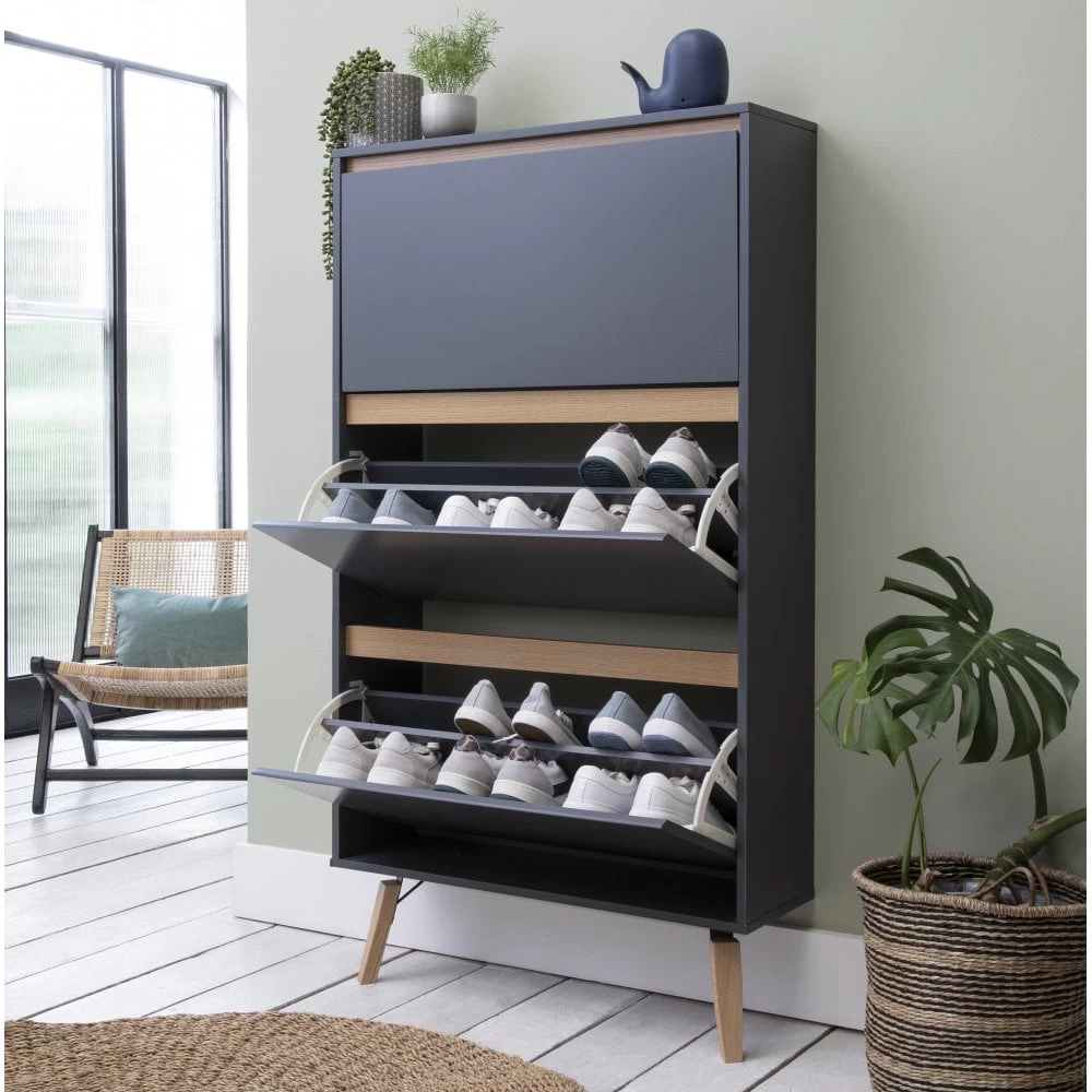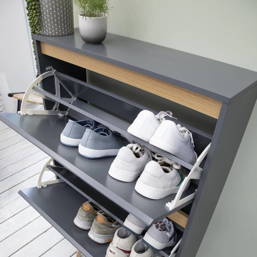 Stylishly organise your footwear with the Otto Shoe Cabinet. This simple and chic design promotes an enviably neat bedroom and offers an elegant home for shoe clutter. Three spacious drawers accommodate all types of footwear, from stilettoes and court shoes to loafers and trainers. Sleek and minimal, Otto generates a serene vibe with its sophisticated styling and unfussy attitude. Available in fresh white or suave grey finishes, the pine shoe cabinet promises to sit beautifully in any bedroom décor. Complement with matching Otto furniture for a graceful flow throughout your bedroom