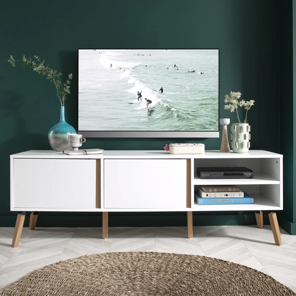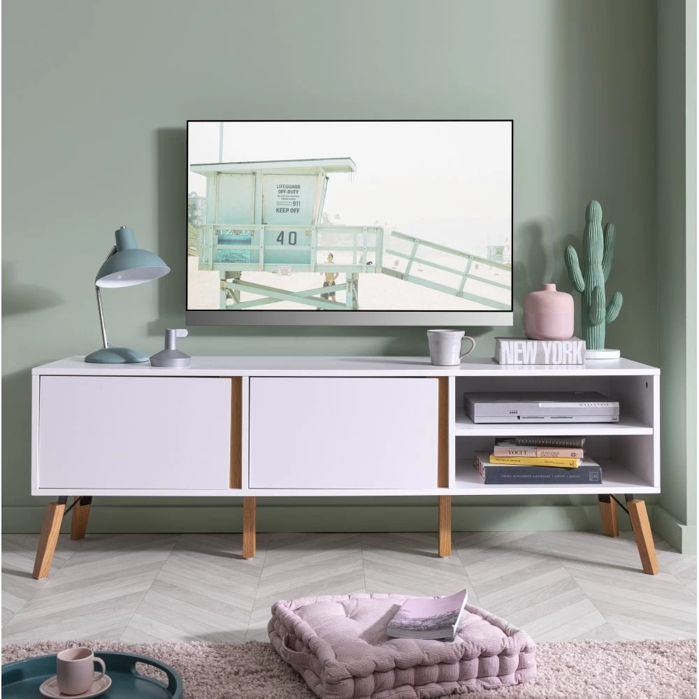 A charming home for all your media-related items, the Otto TV Unit brings a retro touch to any lounge space. Mid-century elements in the shape of vintage-style legs and natural pine accents ooze character, whilst a fresh white colour and sleek, minimalistic lines bring it bang up to date. A wide, spacious cupboard and open shelving provide space for television boxes, game consoles, routers and other TV paraphernalia. This quirky TV unit promises to look on-trend for years to come. Why not mix and match with other pieces from our mid-century modern Otto collection?Â