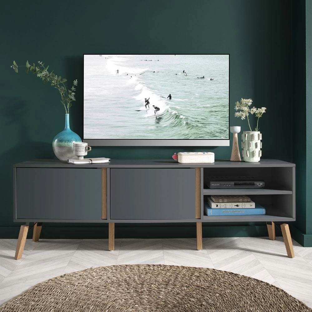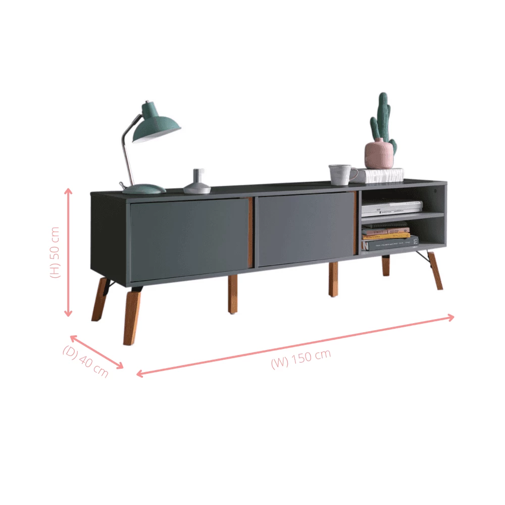 A charming home for all your media-related items, the Otto TV Unit brings a retro touch to any lounge space. Mid-century elements in the shape of vintage-style legs and natural pine accents ooze character, whilst a fresh grey colour and sleek, minimalistic lines bring it bang up to date. A wide, spacious cupboard and open shelving provide space for television boxes, game consoles, routers and other TV paraphernalia. This quirky TV unit promises to look on-trend for years to come. Why not mix and match with other pieces from our mid-century modern Otto collection?Â