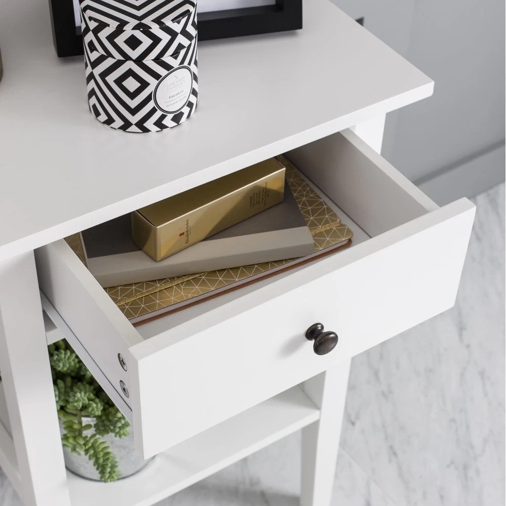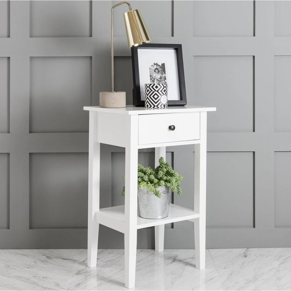 Simple and elegant, this Trend Bedside Cabinet makes a covetable bedside companion. Fusing a slim silhouette with minimal styling, the engineered wood cabinet is essential for creating a clean, serene and chic bedroom. Thanks to its fresh white shade, the table uplifts and brightens whilst adding a modern touch. Its small drawer offers just enough space for storing bedside essentials such as reading glasses and books, whilst the shelf below offers the perfect space to display a pretty lamp. Promising to look beautiful when styled with almost any colour scheme, the white bedside cabinet is both versatile and stylish.